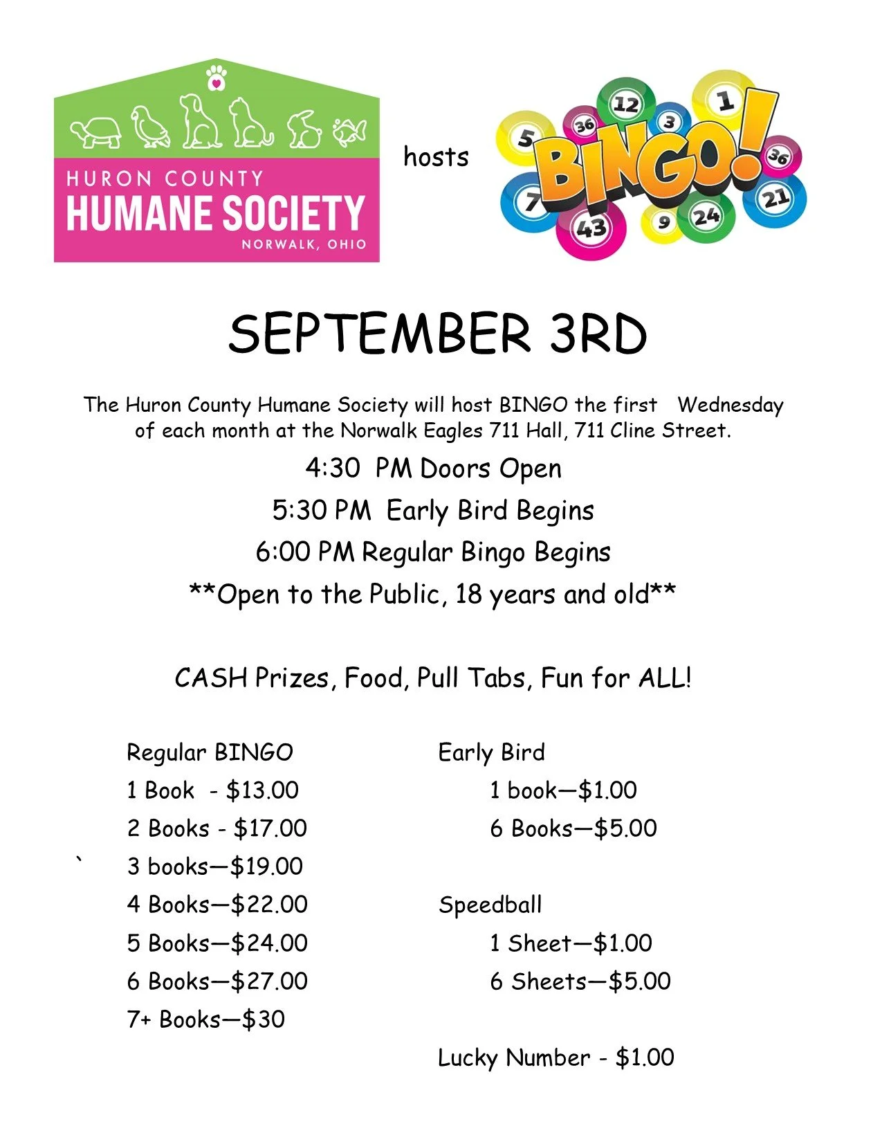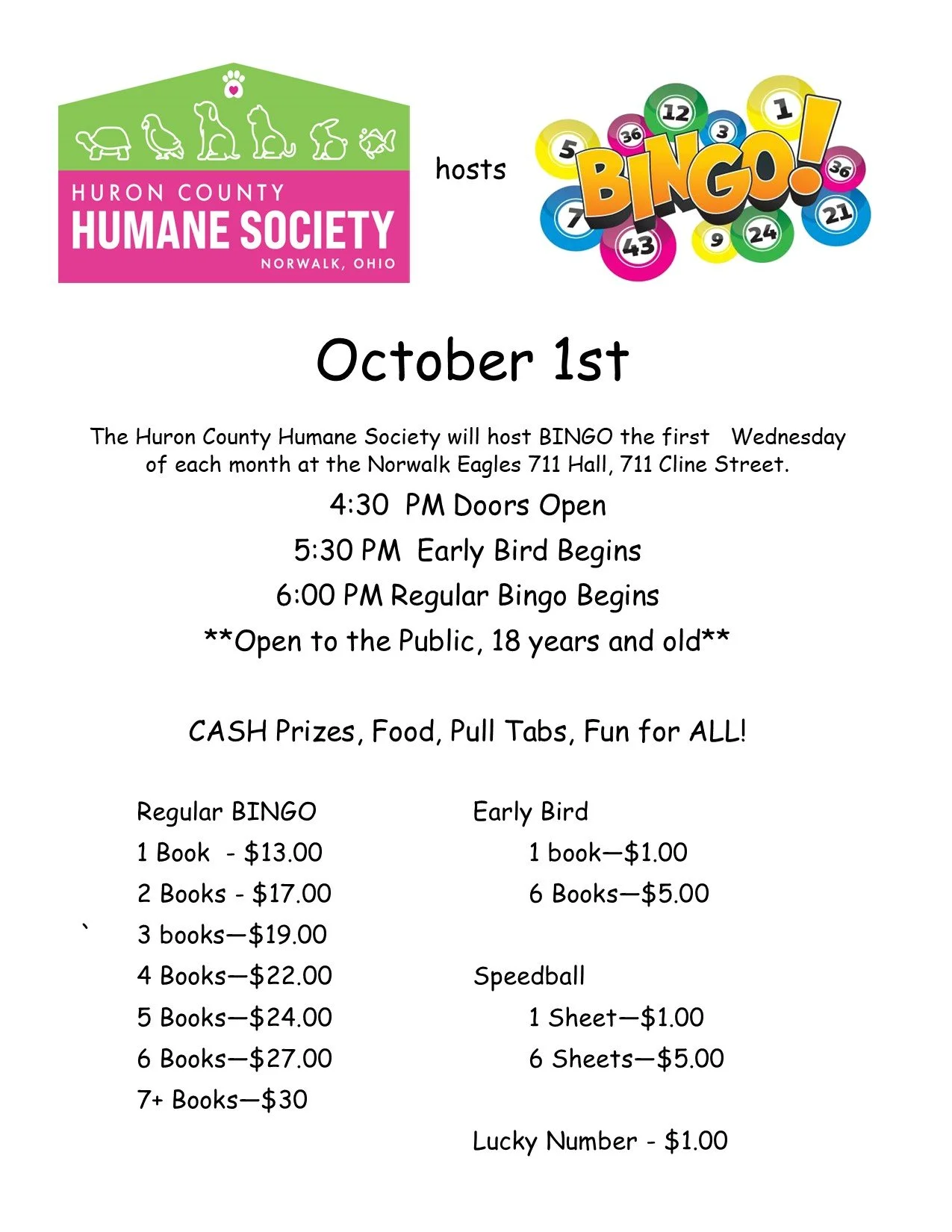 Come Join the Fun! The Huron County Humane Society will host BINGO on Sunday, April 7, 2024 in the Expo Building at the Huron County Fairgrounds (940 Fair Road, Norwalk, OH) from noon till 5 pm. No need to stay for the whole event. Play one game at a time. Each sheet of three cards will be $1. The WINNER of each game splits the pot (proceeds from that game) with the shelter animals. We will also be selling pull tab games. Must be at least 18 years old to participate. Please call 419-663-7158 if you have any questions. Thank you