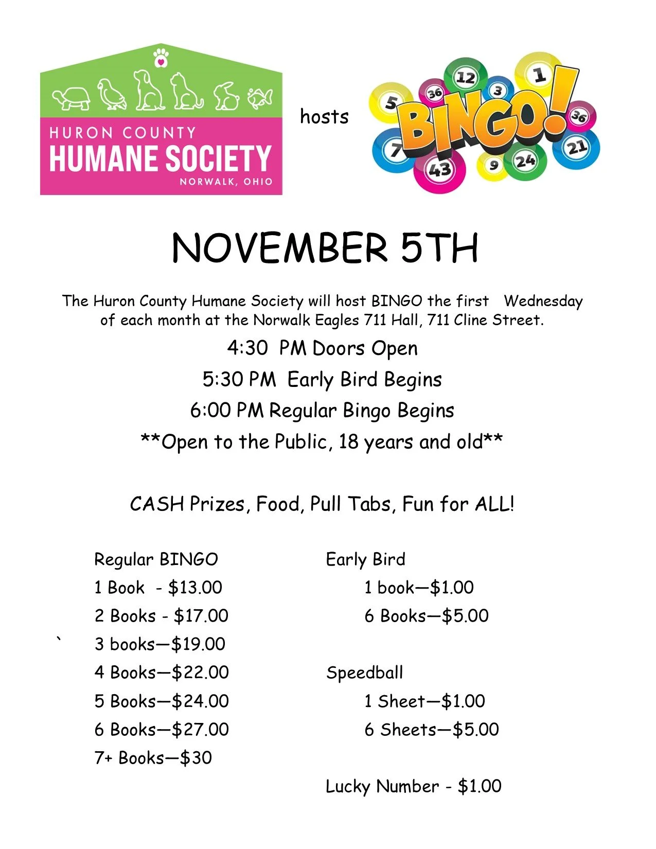 *B*I*N*G*O* Wednesday, November 5, 2025 4:30 PM 9:30 PM 16:30 21:30 Norwalk Eagles 711 Cline Street Norwalk, Ohio, 44857 (map) Google Calendar ICS
